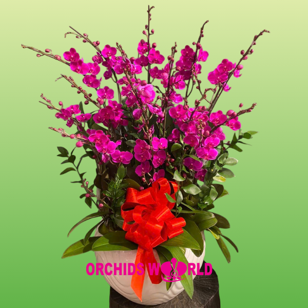 - Mãn Thiên Hồng 15 Cành chỉ với 15 cành mãn thiên hồng người thợ cắm hoa của công ty chúng tôi đã tinh tế tạo thành một chậu lan mang vẻ đẹp có phần hoang dại. Những cành lan vươn cao thể hiện sự trỗi dậy mạnh mẽ với thiên nhiên, khát vọng được chinh phục với những bông hoa nở rộ, luân phiên nhau, hết bông này đến bông kia. Đối với dòng lan hồ điệp này, những cánh lan có phần nhỏ bé hơn, mang lên mình một vẻ đẹp hoang dại hơn so với những dòng lan thuần chủng. Chậu lan mang đến cho người thưởng hoa về một màu sắc mới, một nét đẹp riêng, mà chỉ có mãn thiên hồng mới thể hiện hết vẻ cuống hút, hấp dẫn. Với lối trang trí đơn giản, kết hợp nơ sự kiện đỏ tươi càng tô điểm cho chậu lan thêm phần bắt mắt và độc đáo góp phần mang đến may mắn cho gia chủ, ngoài ra còn có những cành lá chanh được cắm đan xen giúp chậu lan thêm phần đầy đặn.