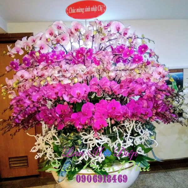 - Chậu Lan Hồ Điệp 100 Cành Tim Hồng Trắng gồm 100 cành lan lộng lẫy được ghép khéo léo tỏa tròn đẹp mắt thành 5 tầng vào chậu men sứ trắng sang trọng dưới bàn tay tinh tế của người thợ cắm hoa của công ty chúng tôi. Lan hồ điệp tím mang trên mình một sắc thái mộng mơ, lãng mạn, một sắc tím đầy ngọt ngào thơ mộng, cũng như tỏa ra một sự quyến rũ kỳ lạ thu hút mọi ánh nhìn từ người thưởng lan khi lần đầu bắt gặp. Các cánh hoa trắng được tô điểm bằng một chút hồng phấn tao nhã, dịu dàng mà lại vô cùng sang trọng xếp cân đối với nhau tạo thành hai hàng đối xứng tự như con bươm bướm đang đong đưa trong nắng mai. Những cánh hồng trông thật mỏng manh làm sao, tạo cho người ngắm nhìn một vẻ đẹp dịu dàng, thuần kiết như thiếu nữ của tuổi đôi mươi. Sự hòa quyện hoàn hảo đó thì dù là một người sắt đá đến mấy chắc chắn rồi cũng phải mềm lòng trước vẻ đẹp dịu dàng toát ra nơi những cánh hoa quyến rũ mang vẻ đẹp nữ tính thật đáng yêu làm sao!