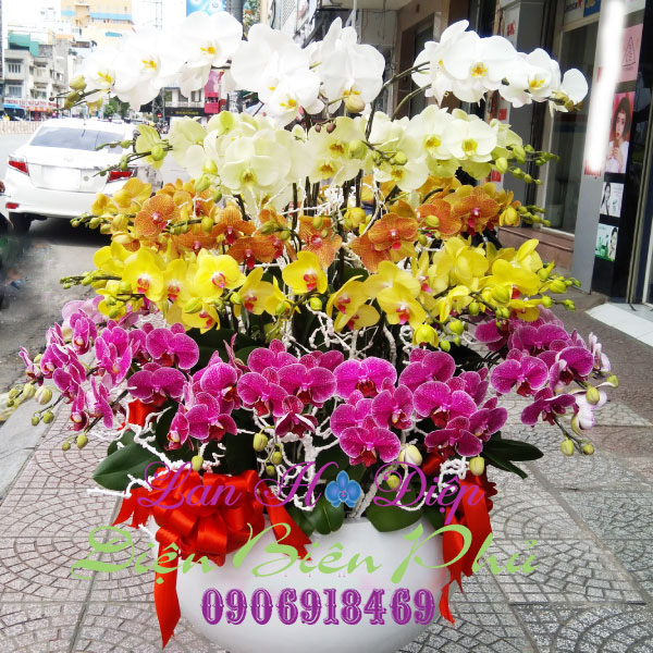 - Chậu Lan Hồ Điệp 40 Cành Tím Vàng Cam Xanh Trắng gồm 40 cành lan tươi tắn và xinh xắn đang khoe sắc đã được công ty chúng tôi cân nhắc chọn lựa kỹ càng ghép thành 5 tầng lan: trắng, xanh, cam, vàng, tím. Các cánh hoa mịn màng, dịu dàng mà lại vô cùng sang trọng xếp cân đối với nhau tạo thành hai hàng đối xứng tự như con bươm bướm đang đong đưa trong nắng mai. Những cành lan cao vượt lên thể hiện sự trỗi dậy với thiên nhiên, khát vọng được chinh phục với những bông hoa nở rộ, luân phiên nhau, hết cái này đến cái kia. Người ta thường bảo, số lượng hoa càng nhiều càng thể hiện sự sung túc và sức sống mãnh liệt của gia chủ. Kết hợp 5 màu lan rực rỡ đã đại diện cho sự may mắn, thích hợp cho khai trương, mang vượng khí đến cho mọi nhà.