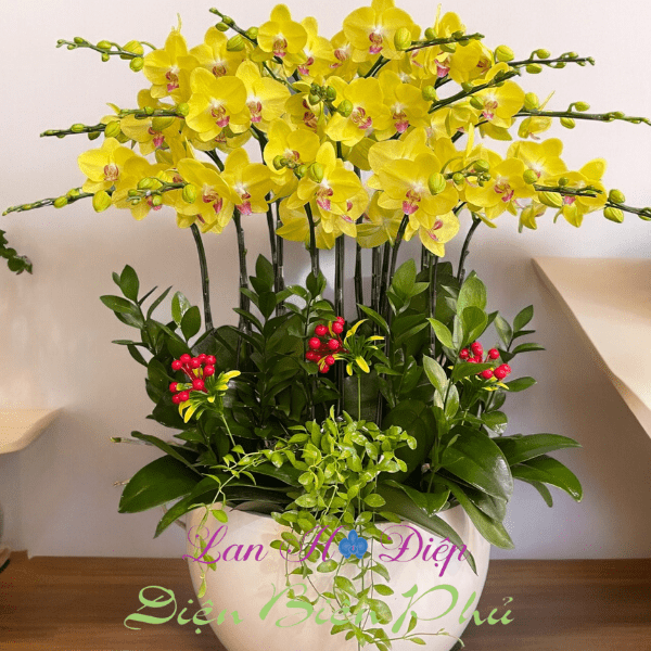 Chậu lan hồ điệp 15 cành vàng được ghép vào chậu sứ trắng sang trọng, đẳng cấp. 15 cành lan được ghép thành 4 tầng, hướng đều về một mặt. Với lối trang trí đơn giản, những cành trái đỏ rực rỡ, một chậu hạt dưa xanh tươi cắm rũ đã tạo điểm nhấn cho chậu, ngoài ra còn có những cành lá chanh cắm đan xen làm chậu thêm phần đầy đặn và sinh động.