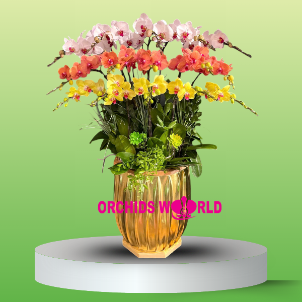 Chậu Lan Hồ Điệp 15 Cành Vàng Cam Trắng là sự kết hợp hoàn hảo giữa 3 sắc lan vàng tươi sáng, cam rực rỡ và trắng tinh khôi được ghép vào chậu bọc da vàng dáng cao vừa làm chậu lan thêm hoành tráng, vừa tôn lên sự sang trọng cho chậu lan. 15 cành lan được người thợ căm hoa ghép vào chậu, phân thành 3 tầng, tầng trên cùng là 5 cành lan trắng tinh khôi, tầng giữa là 5 cành cam rực rỡ và tầng cuối cùng với 5 cành lan vàng tươi tắn. Tất cả kết hợp lại tạo nên một chậu lan hài hòa đến không tả. Để tôn thêm vẻ đẹp cho chậu lan, thì khâu trang trí cũng hết sức quan trọng, phải lựa chọn đồ trang trí phù hợp mới tôn lên vẻ đẹp của chậu lan. Chậu lan được trang trí với một cây hạt dưa xanh tươi cắm rũ, 2 cây sen đá cắm 2 bên làm điểm nhấn, những cây cọ cùng lá chanh cắm đan xen ở phía sau giúp chậu lan thêm đầy đặn và sinh động.