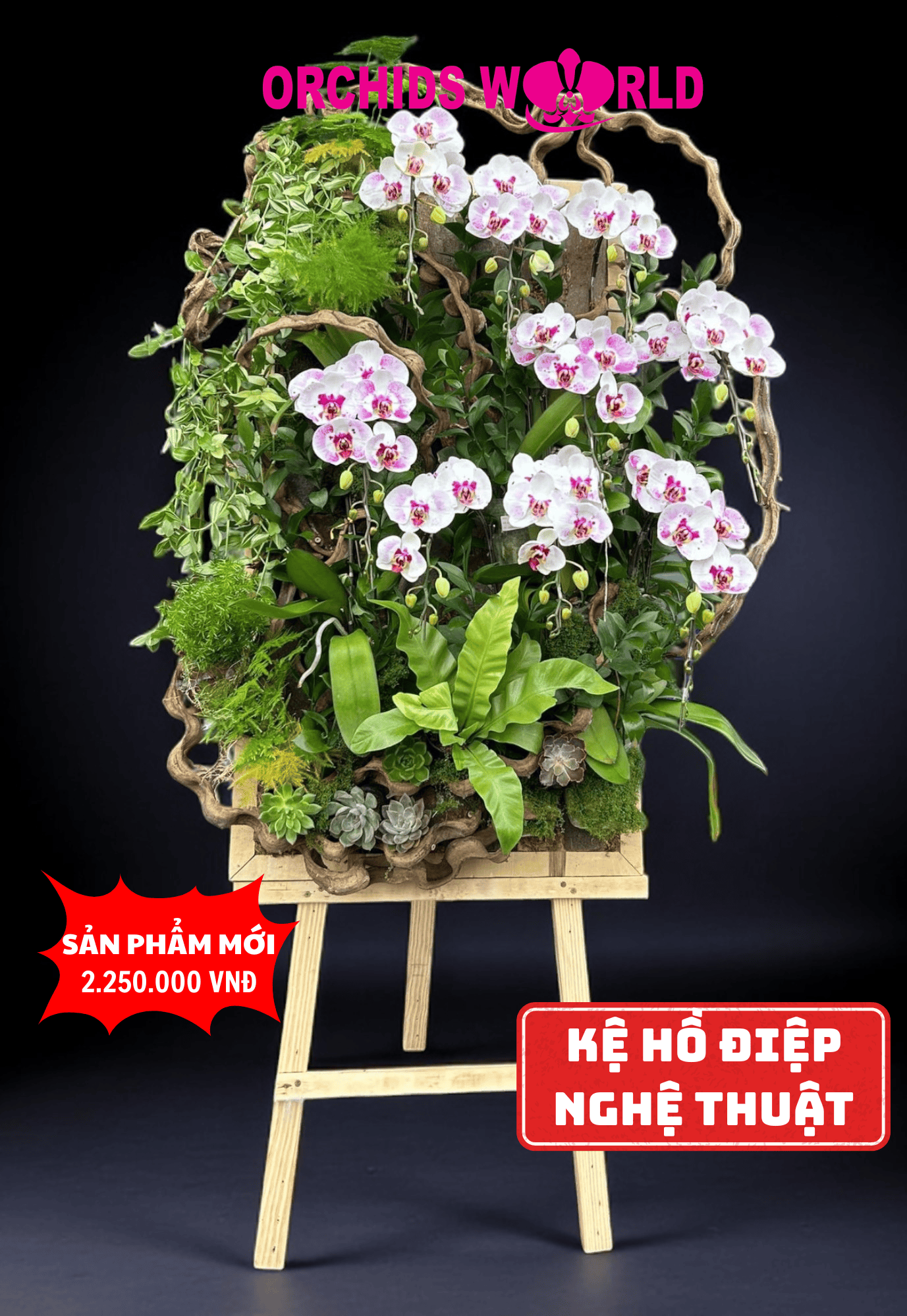 Lấy cảm hứng từ thiên nhiên và nghệ thuật sắp đặt đương đại, thiết kế này là sự kết hợp giữa khung gỗ đứng vững chãi và những cành lan trắng đột biến – mang vẻ đẹp thuần khiết, kiêu sa. Hoa không đơn độc, mà được điểm tô bằng những tiểu cảnh xanh mướt được bố trí tinh tế, tạo nên một không gian ba chiều sống động như một khu vườn thu nhỏ trên nền tranh gỗ. Đây không chỉ là một kệ hoa, mà là một tác phẩm được “thổi hồn”, mang đậm dấu ấn sáng tạo đến từ Orchids World – nơi nghệ thuật cắm hoa vượt lên khỏi khuôn mẫu truyền thống.