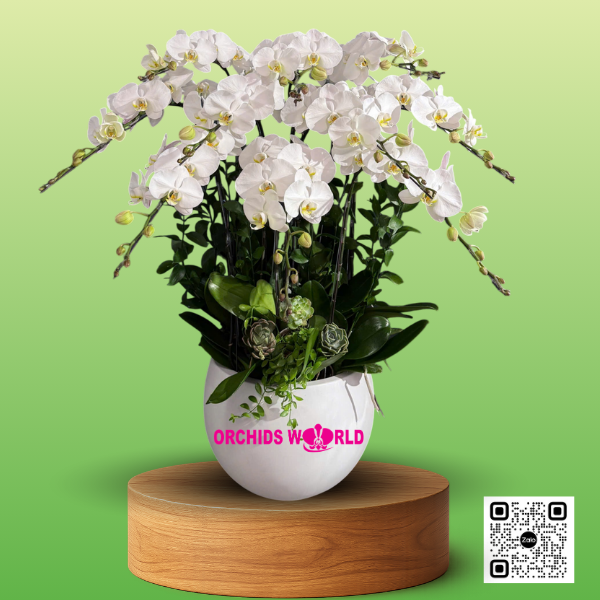 10 cành lan trắng được ghép vào chậu sứ trắng, nhìn có vẻ đơn giản nhưng khi được ghép lên chậu lại mang đến một vẻ đẹp đầy tinh tế và không kém phần sang trọng. Màu trắng của chậu hài hòa với sắc hoa, tạo nên tổng thể thanh thoát và tinh tế. Kiểu chậu trắng phù hợp với hầu hết các không gian khác nhau như phòng khách, quầy lễ tân, văn phòng làm việc hay bàn tiếp khách.