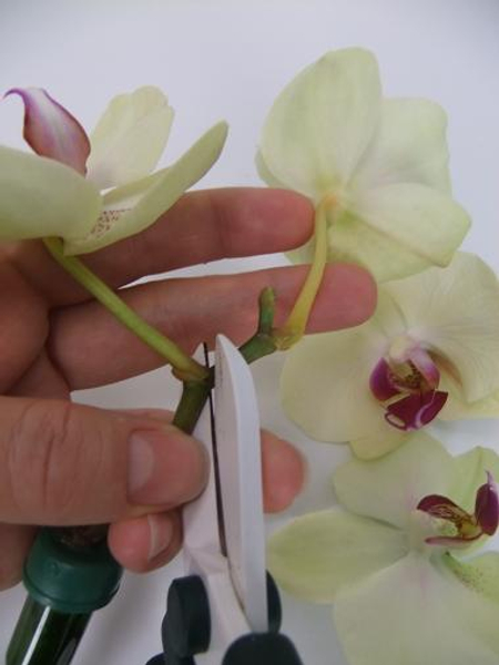 Trước tiên, bạn cắt bỏ hoa. Ta dùng kéo hoặc dao bén để cắt. Để hoa lại cũng không đẹp vì nó đã tàn, làm yếu cây. Bạn nhớ cắt hoa thôi nhé, chừa ngồng dài có mắt ngủ lại để kích kie.