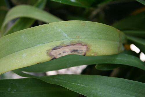 - Triệu chứng: Vết bệnh dạng hình bất định, ủng nước, màu trắng đục, thường lan rộng theo chiều rộng của lá cây phong lan. Gặp thời tiết ẩm ướt mô bệnh bị thối úng, thời tiết khô hanh mô bệnh khô tóp có màu trắng xám.