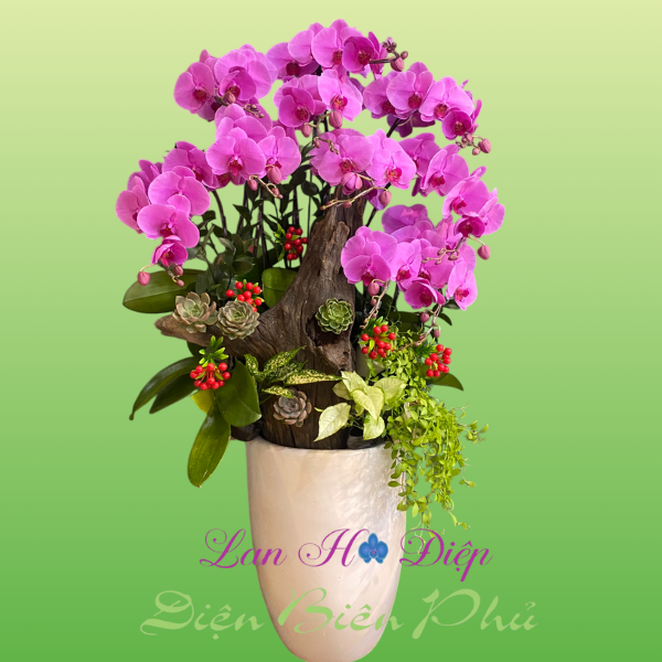 Lan Hồ Điệp ghép lũa 10 cành hồng tím với những cành hoa được người thợ cắm hoa của chúng tôi tinh tế, khóe léo ghép vào chậu sứ trắng cao làm tôn lên vẻ đẹp hoành tráng của chậu lan. Khác với cách cắm phân tầng, 10 cành lan hồng tím được uốn lượn ôm trọn thân gỗ lũa, và đây cũng chính là nét đặc trưng và là điểm nhấn cho chậu lan. Hoa lan mang sắc hồng nhẹ nhàng pha lẫn chút tím mộng mơ tạo nên sự quyến rũ, kết hợp cùng gỗ lũa mộc mạc tạo nên tác phẩm nghệ thuật độc đáo. Chậu lan được trang trí với cây ngọc ngân, cây môn cảnh, 2 cây hạt dưa cắm rũ giúp chậu thêm đầy đặn hơn, ngoài ra còn có những cây sen đá xinh xắn, trái đỏ rực rỡ góp phần điểm thêm sắc màu cho chậu lan.