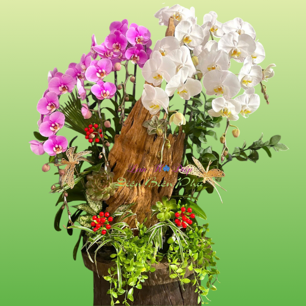 Chậu lan hồ điệp ghép lũa 7 trắng hồng anna cành mang vẻ đẹp thanh thoát, nhẹ nhàng, với sự kết hợp tinh tế giữa sắc trắng tinh khôi và hồng Anna dịu dàng. Những cành lan được ghép tỉ mỉ trên khúc lũa dáng đứng, nghiêng nhẹ qua bên phải, tạo thế vững chãi và uyển chuyển. Tấm gỗ bên dưới làm đế tạo độ chắc chắn và vững chãi, làm nổi bật nét đẹp tự nhiên của tổng thể. Các cành lan được cắm hướng về một mặt, khoe trọn vẻ đẹp của những bông hoa tròn mịn, mềm mại, những cành lan được người thợ cắm hoa uốn rũ xuống phủ xuống dáng lũa mang đến sự uyển chuyển, mềm mại như bức tranh thiên nhiên sống động