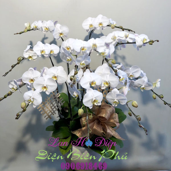 - Lan Hồ Điệp Tết Trắng 11 Cành gồm 11 cành lan trắng tinh khôi ghép khéo léo vào chậu men sứ sang trọng mang biểu tượng về sự may mắn và nhiều điều tốt đẹp. Mười một cành lan trắng được ghép thành 3 tầng: tầng 1 gồm 2 cành, tầng 2 gồm 4 cành và tầng 3 gồm 5 cành với những bông lan đang nở rộ khoe sắc trong nắng mai như người thiếu nữ độ tuổi xuân thì với tấm lòng trinh nguyên, tình yêu trong sáng và thuần túy. Lưỡi vàng như một nét chấm phá cho cành lan thêm độc đáo. Số 11 là cặp số kép biểu tượng cho sự thăng hoa và hy vọng mang lại bình yên, được trời phú đặc biệt là giúp thu hút tài lộc. Đây chính là lời chúc hoàn mỹ của người tặng gửi đến người nhận trong các dịp đặc biệt như lễ tết, năm mới...