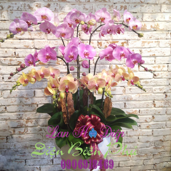 - Chậu Lan Hồ Điệp Đột Biến 10 Cành Cam Hồng gồm 10 cành lan hồ điệp đột biến với 2 sắc màu hồng và cam được ghép khéo léo vào chậu men sứ sang trọng. Tầng 1 gồm 3 cành lan hồ điệp hồng đột biến có kích thước lớn nhất với những sọc trắng, tầng 2 gồm 3 cành lan hồng hoa na có kích thước tầm trung với vẻ đẹp dịu dàng, đằm thắm kết hợp cùng tầng 3 gồm 4 cành lan hồ điệp cam có kích thước nhỏ nhất trông thật bắt mắt làm sao. Tất cả hài hòa với nhau tạo nên một vẻ đẹp đặc sắc cho chậu lan. Mỗi cành lan có khoảng từ 6 đến 8 bông hoa to tròn đang nở rộ, đua nhau khoe sắc. Người thợ cắm hoa của công ty chúng tôi thật tinh tế làm sao khi trang trí bằng những bản gỗ thông mộc mạc, giản dị kết hợp với chiếc nơ sự kiện nổi bật cả một góc chậu càng tôn lên vẻ đẹp thanh cao và sang trọng cho chậu lan.