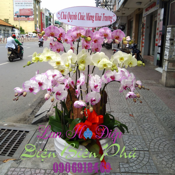 - Chậu Lan Hồ Điệp Đột Biến 12 Cành Trắng Xanh Hồng được ghép khéo léo thành 3 tầng hoa với 12 cành lan hồ điệp mang 3 sắc màu tươi tắn khác nhau. Người thợ cắm hoa thật tinh tế làm sao khi ghép số lượng cành hoa tăng dần qua các tầng: tầng 1 gồm 3 cành lan hồ điệp hồng đột biến với những sọc trắng, tầng 2 gồm 4 cành lan hồ điệp xanh bơ rạng ngời, tươi sáng và tầng 3 gồm 5 cành lan hồ điệp trắng đột biến với những viền hồng quanh cánh hoa, tất cả hòa quyện với nhau tạo nên một vẻ đẹp đặc sắc. Điều này thể hiện tấm lòng chân thành của người tặng gửi gắm đến người nhận về một lời chúc may mắn, vạn sự như ý, ngày càng phát triển theo năm tháng trong dịp chúc mừng khai trương. Chậu lan được trang trí đơn giản, là một sự kết hợp hài hòa của những bản gỗ thông to dày, mộc mạc kết hợp với nơ sự kiện đỏ tươi càng tôn lên vẻ đẹp sang trọng, quý phái của dòng lan.