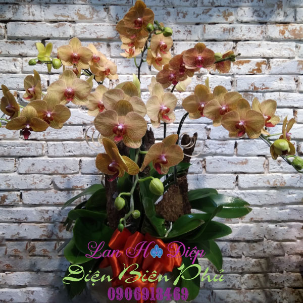 - Chậu Lan Hồ Điệp Đột Biến 6 Cành Cam gồm 6 cành lan cam sọc rực rỡ được ghép khéo léo vào nhau tạo thành 2 tầng hoa, mỗi tầng gồm 3 cành đẹp mắt đua nhau khoe sắc. Mỗi cành lan có độ rộng khoảng 60 cm bao gồm nhiều đóa hoa, nở từ hoa này đến hoa khác, luân phiên với nhau. Những cành lan với các bông đã nở rộ và trên lưỡi hoa tựa như những viên ngọc bắt mắt đang đua nhau khoe sắc giống như những con bướm xinh xắn đong đưa trong nắng mai. Người ta thường bảo, số lượng hoa càng nhiều càng thể hiện sự sung túc của gia chủ cùng với sức sống mãnh liệt, sự trỗi dậy mạnh mẽ của thiên nhiên. Phong cách trang trí đơn giản với những bản gỗ thông mộc mạc, to dày cùng chiếc nơ sự kiện đỏ tươi càng giúp cho chậu lan thêm phần đặc sắc và bắt mắt.