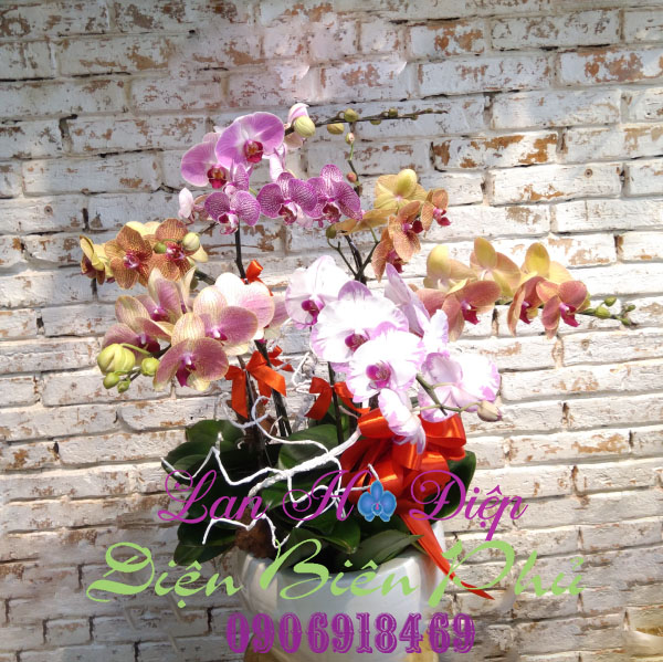 - Hồ Điệp vốn dĩ được mệnh danh là "Nữ hoàng của các loại lan" bởi vẻ đẹp kiêu sa, không kém phần quý phái. Ngày nay, Lan Hồ Điệp với nhiều kiểu dáng, màu sắc, kích thước đa dạng, phong phú tạo nên những vẻ đẹp lạ mắt, thu hút mọi ánh nhìn của người thưởng hoa. Vì vậy, Lan Hồ Điệp trở thành lựa chọn hàng đầu trong thời gian gần đây cho các dịp đặc biệt như lễ tết hay mừng khai trương. Để cung cấp cho thị trường những sản phẩm đẹp mắt và chất lượng không chỉ nhờ công chăm sóc, sự tỉ mỉ trong khâu nuôi trồng mà còn phải dựa vào óc sáng tạo và bàn tay trang trí khéo léo của người tạo ra sản phẩm. Công ty chúng tôi đã tạo ra những chậu Lan Hồ Điệp khoe sắc nhất để gửi đến quý khách hàng như một lời tri ân.