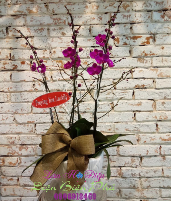- Chậu Lan Hồ Điệp Tím 3 Cành được trang trí khá là đơn giản, không cầu kỳ nhưng không hề làm mất đi vẻ đẹp sang trọng, quý phái của dòng lan. Những cành lan vươn cao mang những bông hoa tím biếc thể hiện sự trỗi dậy mạnh mẽ của thiên nhiên, cũng như thể hiện sức mạnh của con người, khát vọng chinh phục. Cùng với những lá to xanh và dày góp phần tô điểm cho toàn bộ chậu lan Hồ Điệp này. Những cành tuyết trắng bao phủ lấy cành lan làm mất đi sự đơn điệu, buồn tẻ. Và một chiếc nơ to màu xám là điểm nhấn khá đặc sắc đấy, khắc họa một phần nào sự mộc mạc, giản dị.