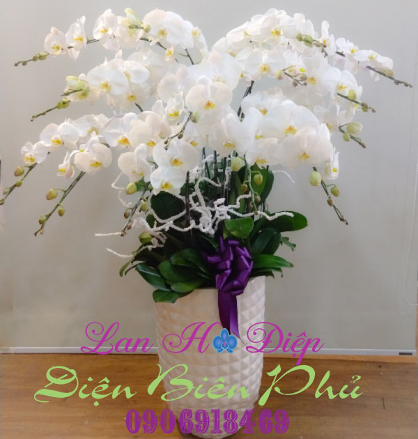- Chậu Lan Hồ Điệp Trắng 15 Cành là một sản phẩm tiêu biểu và tượng trưng cho Lan Hồ Điệp dùng trong trưng bày, trang trí và quà biếu tặng. Các cành lan được người cắm hoa khéo léo tạo hình thành 3 tầng lan: tầng 1 gồm 3 cành, tầng 2 gồm 5 cành và tầng 3 gồm 7 cành một mặt xòe ra xum xuê thể hiện sự sung túc và cuộc sống ấm no, hạnh phúc. Những cánh hoa to dày và cân đối cùng với chiếc môi vàng uốn cong cong tự như con bướm xinh xắn đang đong đưa trong nắng mai chào đón ngày mới. Màu trắng là màu đại diện cho sự thuần khiết, trong sáng và trinh nguyên nên chính là tấm lòng chân thành, tình cảm thiêng liêng của người tặng gửi đến người nhận.