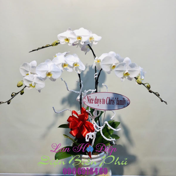 - Chậu Lan Hồ Điệp Trắng 3 Cành 2 Tầng Size Trung gồm 3 cành trắng có kích thước tầm trung được ghép thành 2 tầng: tầng trên gồm 1 cành và tầng dưới gồm 2 cành một cách độc đáo mới lạ trong chậu sứ cao cấp góp phần tăng lên sự sang trọng của dòng lan. Màu trắng đại diện cho sự ngây thơ, trong sáng và trinh nguyên nên chính là biểu tượng tình yêu thuần khiết thiêng liêng của đôi trai gái trẻ. Mỗi cành Hồ Điệp trắng có từ 8-10 bông tạo thành một cụm hoa nổi bật trên nền xanh của lá và hài hòa với sắc chậu. Lưỡi hoa vàng tươi thắm chấm phá cho nét đẹp của nền trắng tinh khôi thêm rực rỡ. Có lẽ vì vậy, mà những người yêu nhau hay tặng nhau Lan Hồ Điệp Trắng để gửi gắm tình cảm.