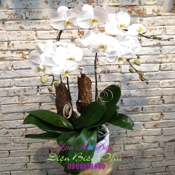 - Chậu Lan Hồ Điệp Trắng 3 Cành gồm 3 cành hoa màu trắng đan nối vào nhau một cách khéo léo tạo nên hai tầng hoa với 1 cành cao hơn hẳn hai cành còn lại. Hoa lan có sắc trắng tinh khiết, cánh hoa tròn đầy, màu sắc tươi sáng tượng trưng cho ý nghĩa phong thủy tốt đẹp. Độ rộng của cành hoa chỉ khoảng 60 cm, các cánh hoa có kích thước từ 12 đến 13 cm xoè rộng kín xếp đều đặn hai bên cành với độ chớm nở vừa phải. Nổi bật trên nền trắng tinh khôi là màu vàng óng ánh của lưỡi hoa cong dẹp có hai râu dài tạo nên nét đẹp đặc sắc.