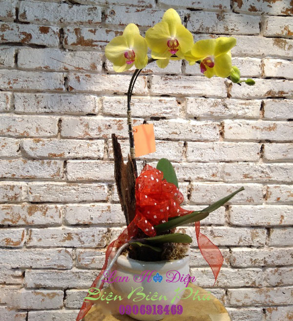 - Chậu Lan Hồ Điệp Vàng 1 Cành trở nên đẹp mắt, ấn tượng và ý nghĩa hơn dưới bàn tay của những thợ trang trí thủ công, tạo dáng thiết kế của công ty chúng tôi. Sử dụng bản gỗ thông to, có phần tự nhiên là một sự kết hợp hài hòa toát lên một vẻ đẹp mộc mạc, đơn giản nhưng không mất đi vẻ đẹp sang trọng vốn có. Chiếc nơ màu đỏ tươi như tô thêm điềm may mắn đến cho gia chủ. Chậu Lan này được trang trí bằng chậu men sứ trắng trơn với cổ chậu ôm vào cành lan càng tôn lên dáng vẻ yêu kiều, quý phái của dòng lan. (Tuy nhiên, bạn có thể chọn mẫu chậu sứ trắng hay màu, trơn hay sọc tùy theo sở thích của bạn).