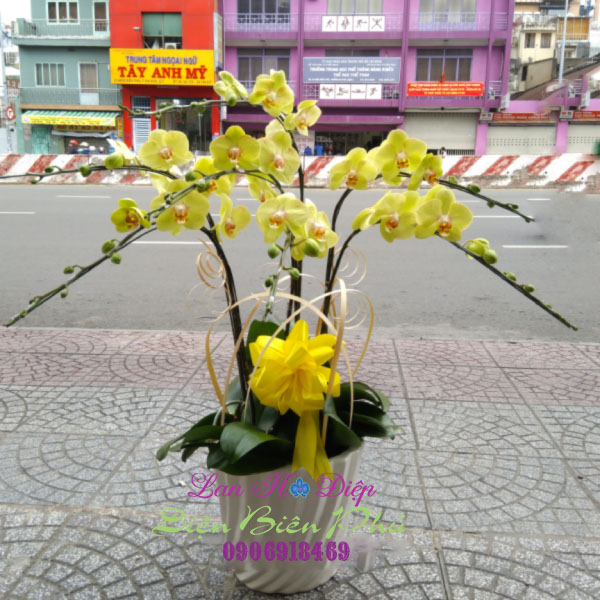 - Chậu Lan Hồ Điệp Vàng 7 Cành 3 Tầng gồm 7 cành lan vàng tươi thắm được ghép khéo léo vào nhau tạo thành 3 tầng hoa thay nhau khoe sắc. Những cành hoa của Lan Hồ Điệp chủ yếu được mọc ra từ nách lá. Một cành lan có độ rộng khoảng 60 cm bao gồm nhiều đóa hoa và nở từ hoa này đến hoa khác, luân phiên với nhau. Từ trước đến nay, màu vàng chính là biểu tượng của sự sung túc, ấm no và thịnh vượng thể hiện một mong ước về cuộc sống đầy đủ. Màu vàng tươi mới này như mang đến một luồng sinh khí mới, một sức sống mới vừa dạt dào vừa mãnh liệt.
