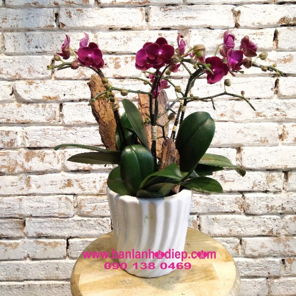 - Lan Tiểu Hồ Điệp Tím 3 Cành được trang trí khá đơn giản với các bản gỗ thông lớn tạo nên sự mộc mạc, gần gũi với thiên nhiên. Sử dụng chậu men sứ trắng viền cong sọc dài càng tôn lên vẻ đẹp sang trọng của dòng lan. Với kích thước khá là kiêm tốn, nhưng vẻ đẹp của chậu lan vẫn bừng sáng cả một không gian trưng bày. Vẻ đẹp ngất ngay ấy khiến bao nhiêu người đắm, bao nhiêu người say phải không?